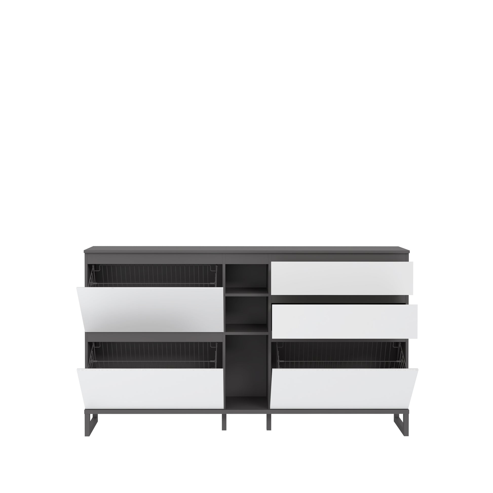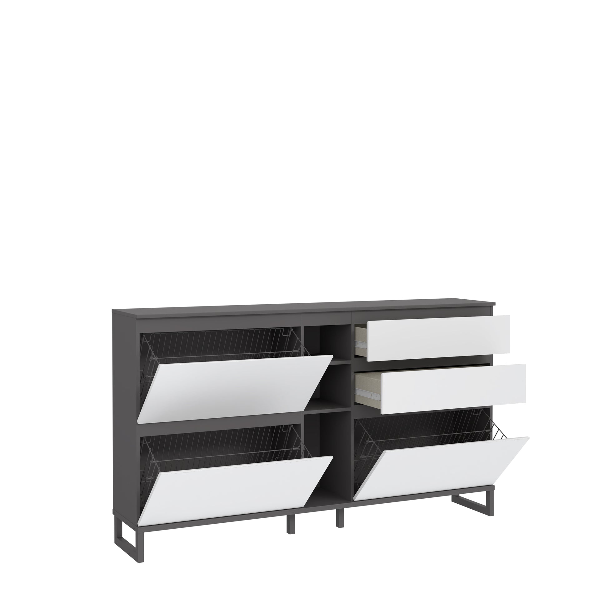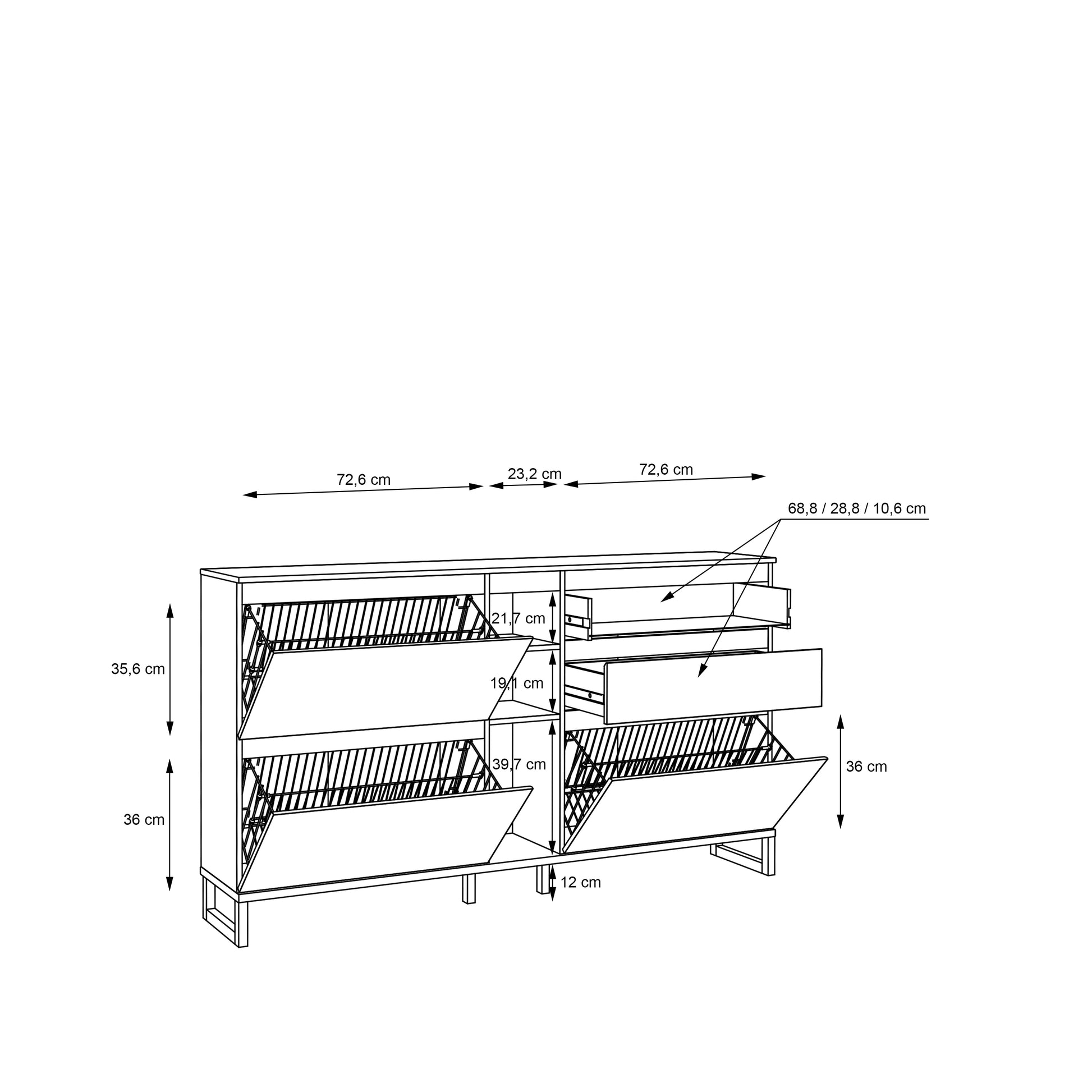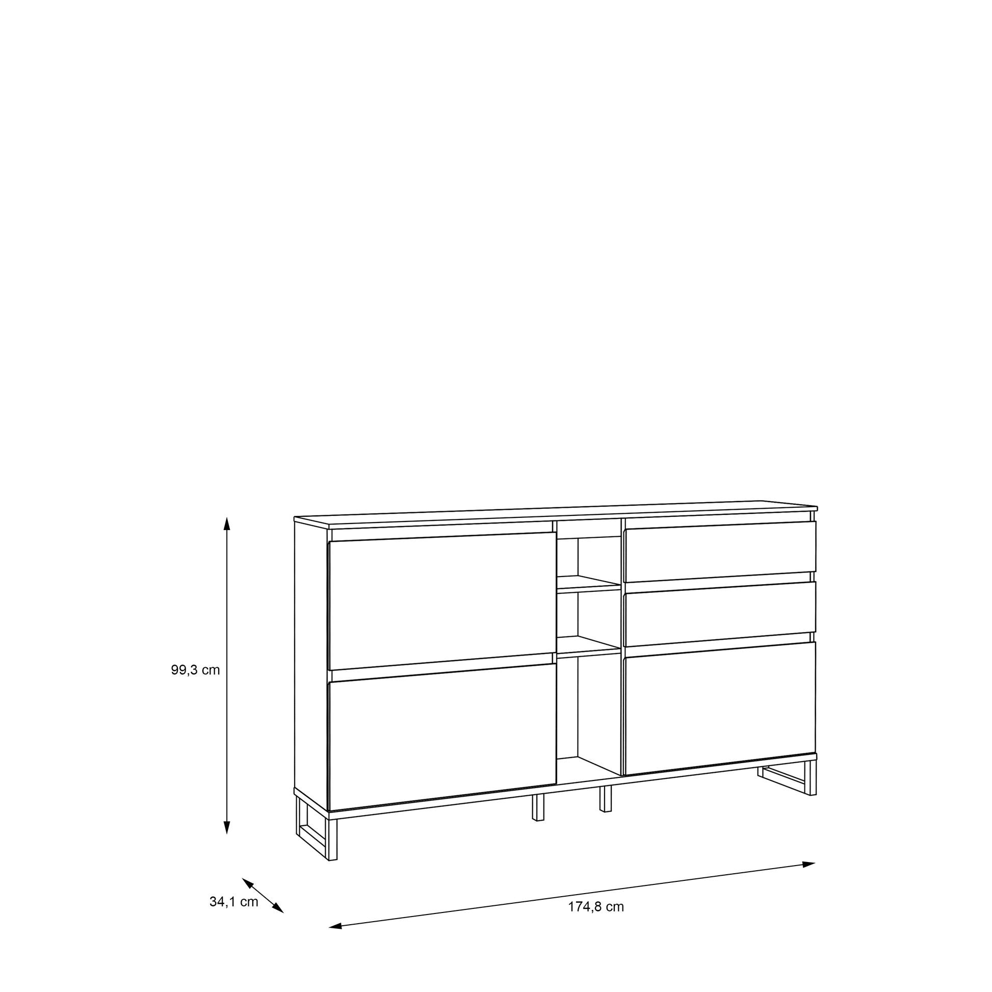 Aprašymas: Ši batų spintelė su lentynomis ir dviem stalčiais, pagaminta iš aukštos kokybės medžiagų, praturtins jūsų interjerą savo moderniu dizainu. Jos išmatavimai yra 174.8 cm ilgio, 99.3 cm aukščio ir 34.1 cm pločio. Baldas itin kompaktiškas ir funkcionalus, todėl puikiai tiks kiekvienai erdvei.