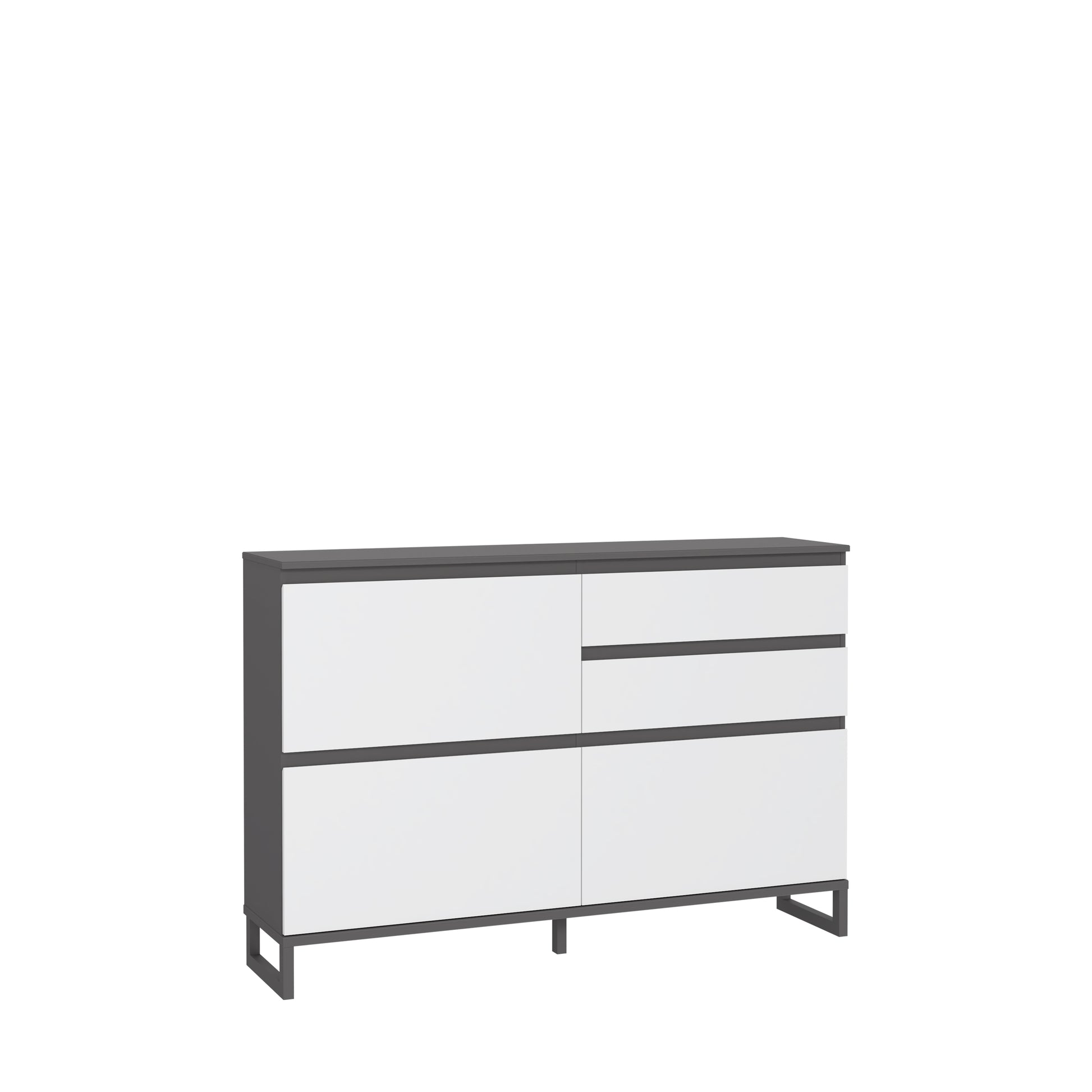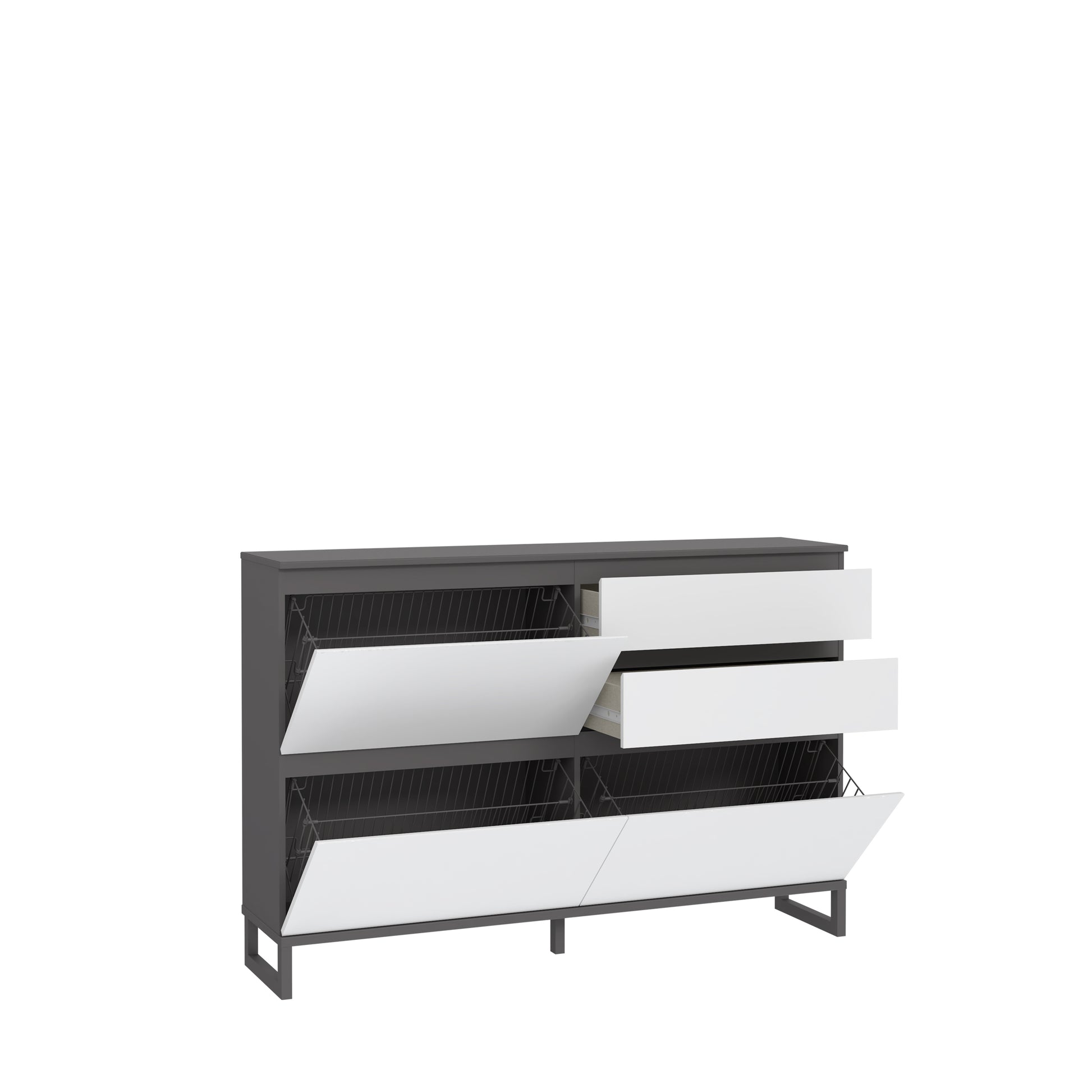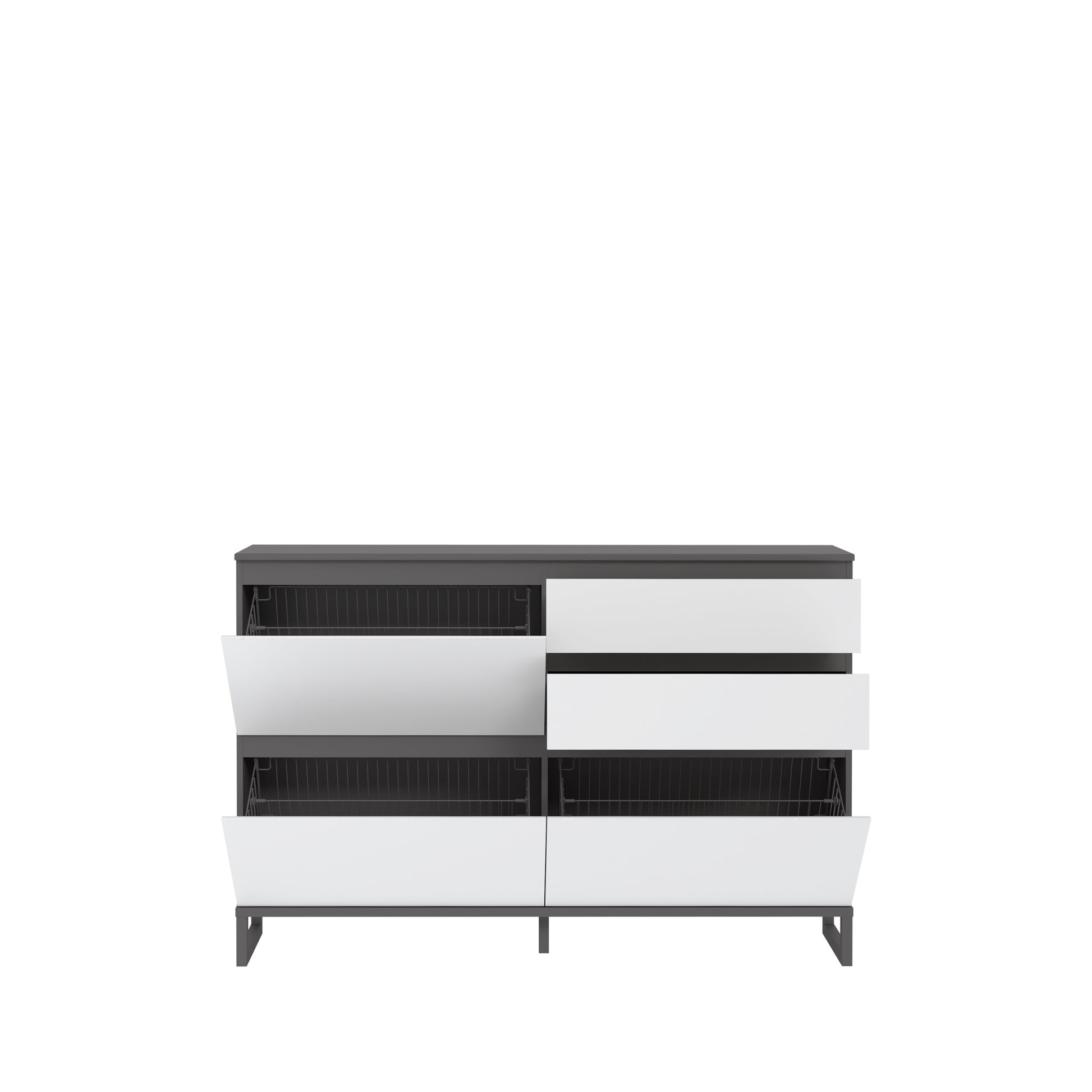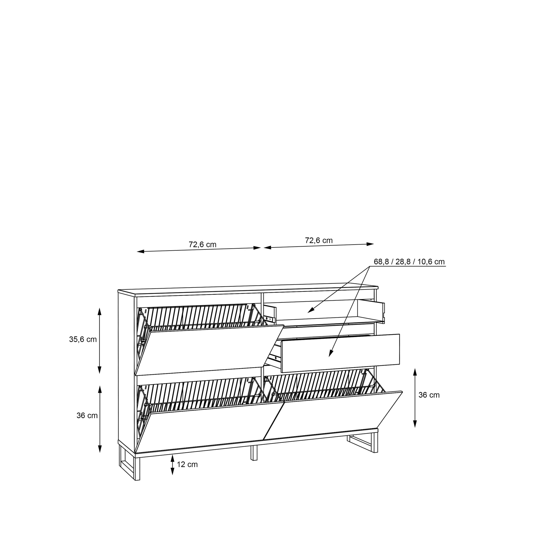 Aprašymas: Ši batų spintelė su lentynomis ir dviem stalčiais, pagaminta iš aukštos kokybės medžiagų, praturtins jūsų interjerą savo moderniu dizainu. Jos išmatavimai yra 150.1 cm ilgio, 99.3 cm aukščio ir 34.1 cm pločio. Baldas itin kompaktiškas ir funkcionalus, todėl puikiai tiks kiekvienai erdvei.