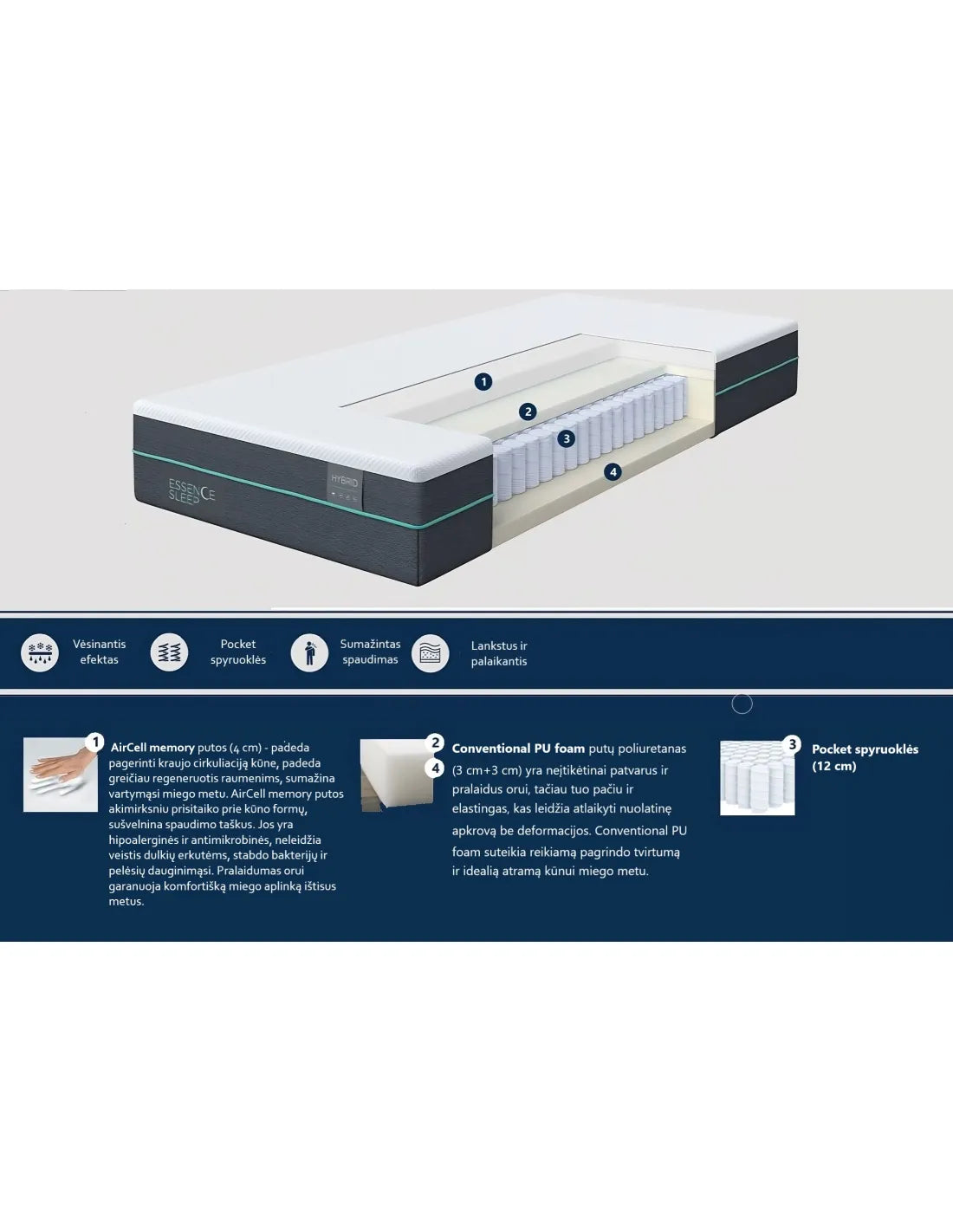 Aprašymas: Tai hibridinis – kombinuotas čiužinys iš Pocket spyruoklių bloko gaubiamo abiejose pusėse Conventional PU putų poliuretano(3 cm) ir padengtas AirCell memory medžiaga (4 cm) Šis čiužinys Jums pasiūlys ypatingą komfortą, tvirtą kūno atramą ir tiesingą stuburo padėtį miego metu. Hybrid čiužinys neperduoda judesių šalia miegančiam, todėl ypatingai tinka daug besivartantiems. Yra puikiai prisitaikantis, dėka AirCell memory medžiagos nespauždžia pagrindinių kūno atramos taškų.