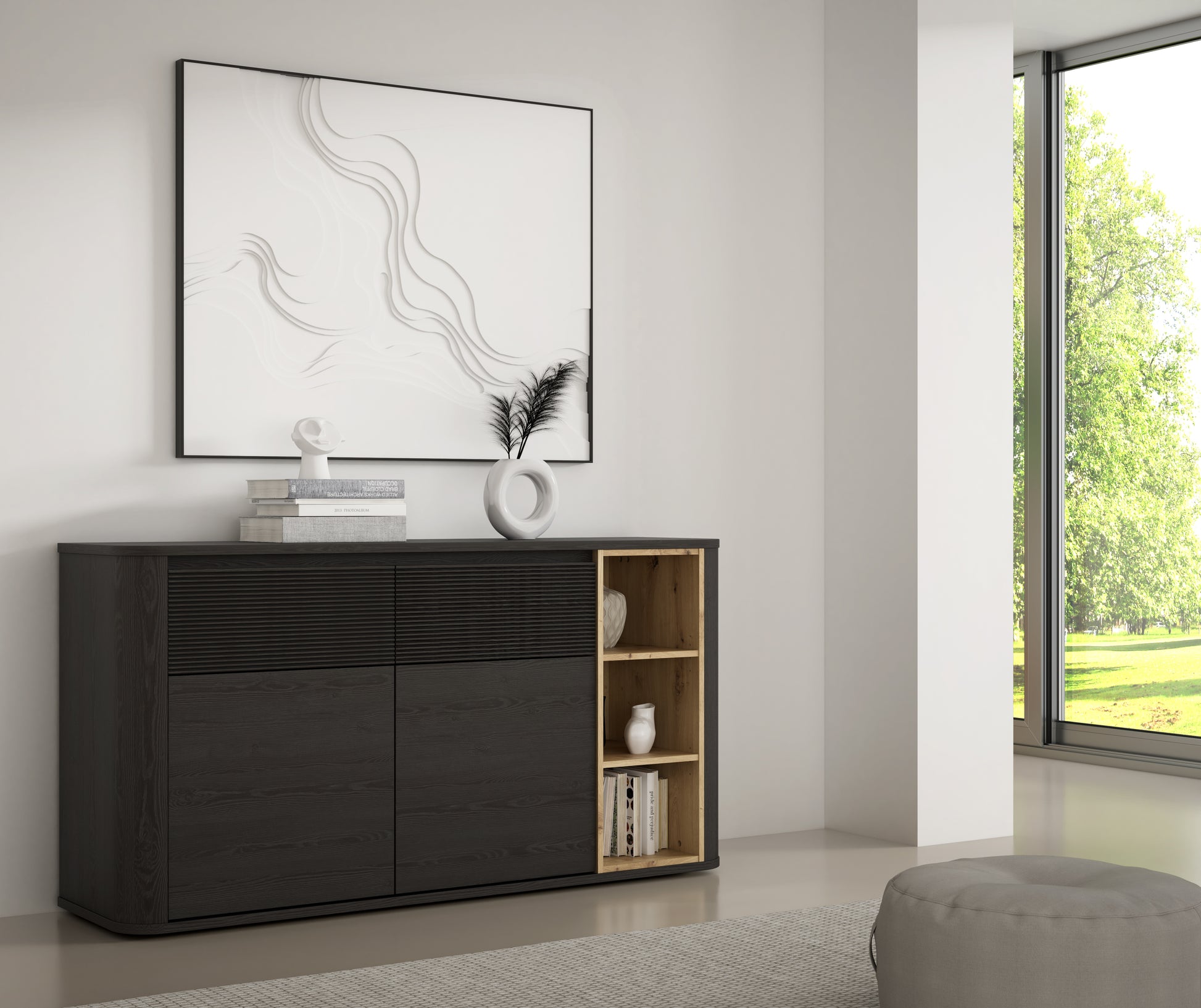Aprašymas: Breathake kolekcijos komoda – tai praktiškas ir stilingas sprendimas Jūsų svetainei. Juodos spalvos korpusas su vertikaliu reljefu subtiliai kontrastuoja su ąžuolo spalva, kuri suteikia interjerui šilumos ir natūralumo. Komoda turi stalčius, uždaras spintelės, kur puikiai sutalpinsite norimus daiktus.