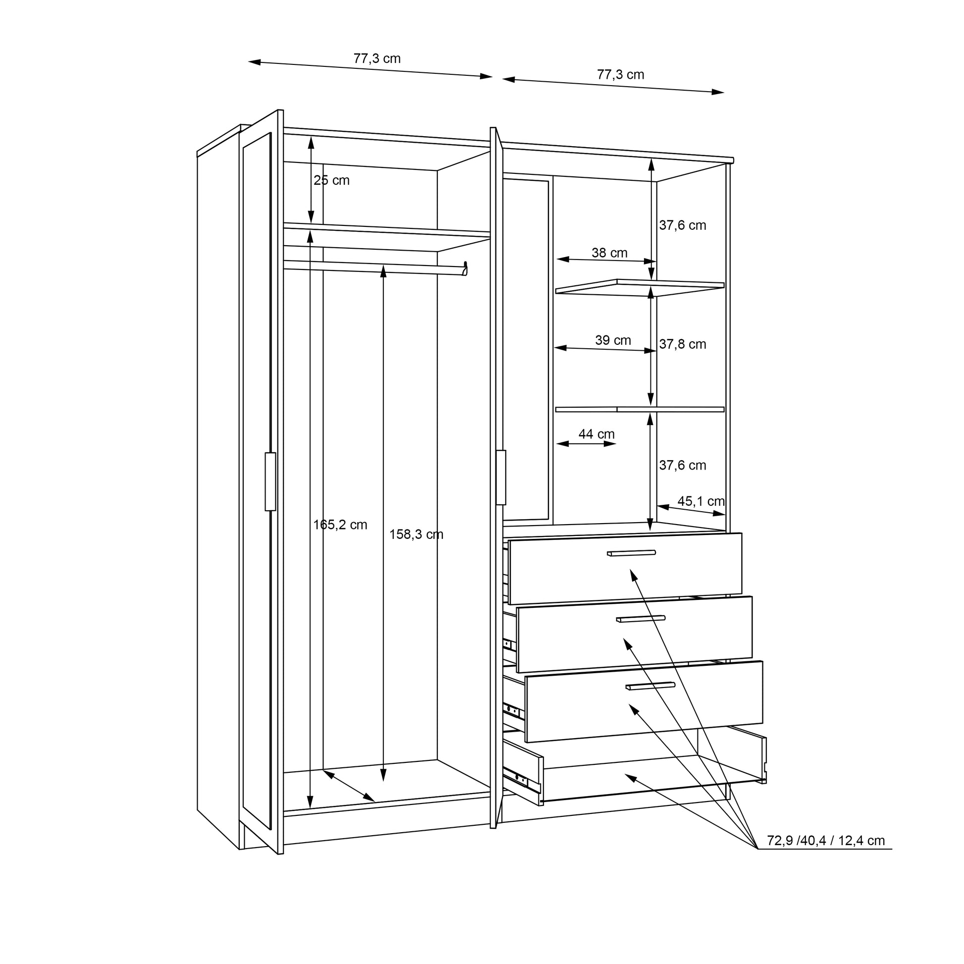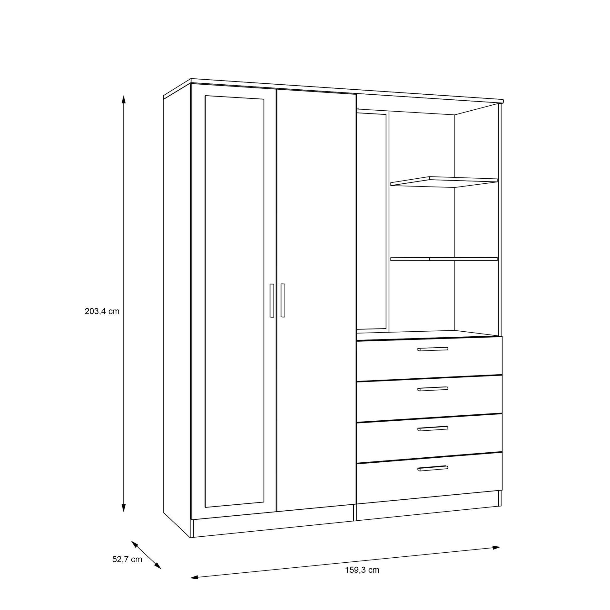 - Išmatavimai:→ 159.3 ↑ 203.4 ↗ 52.7 cm