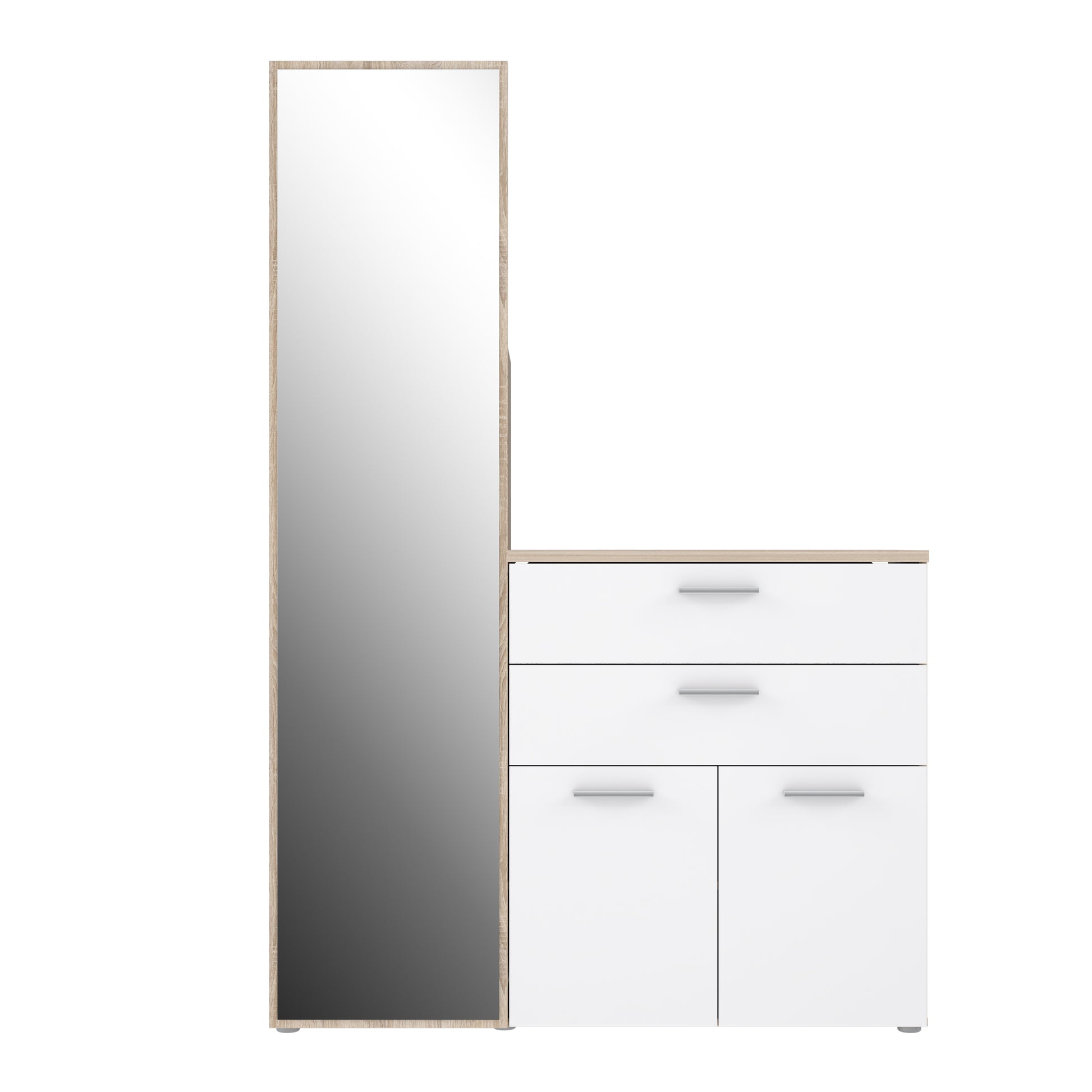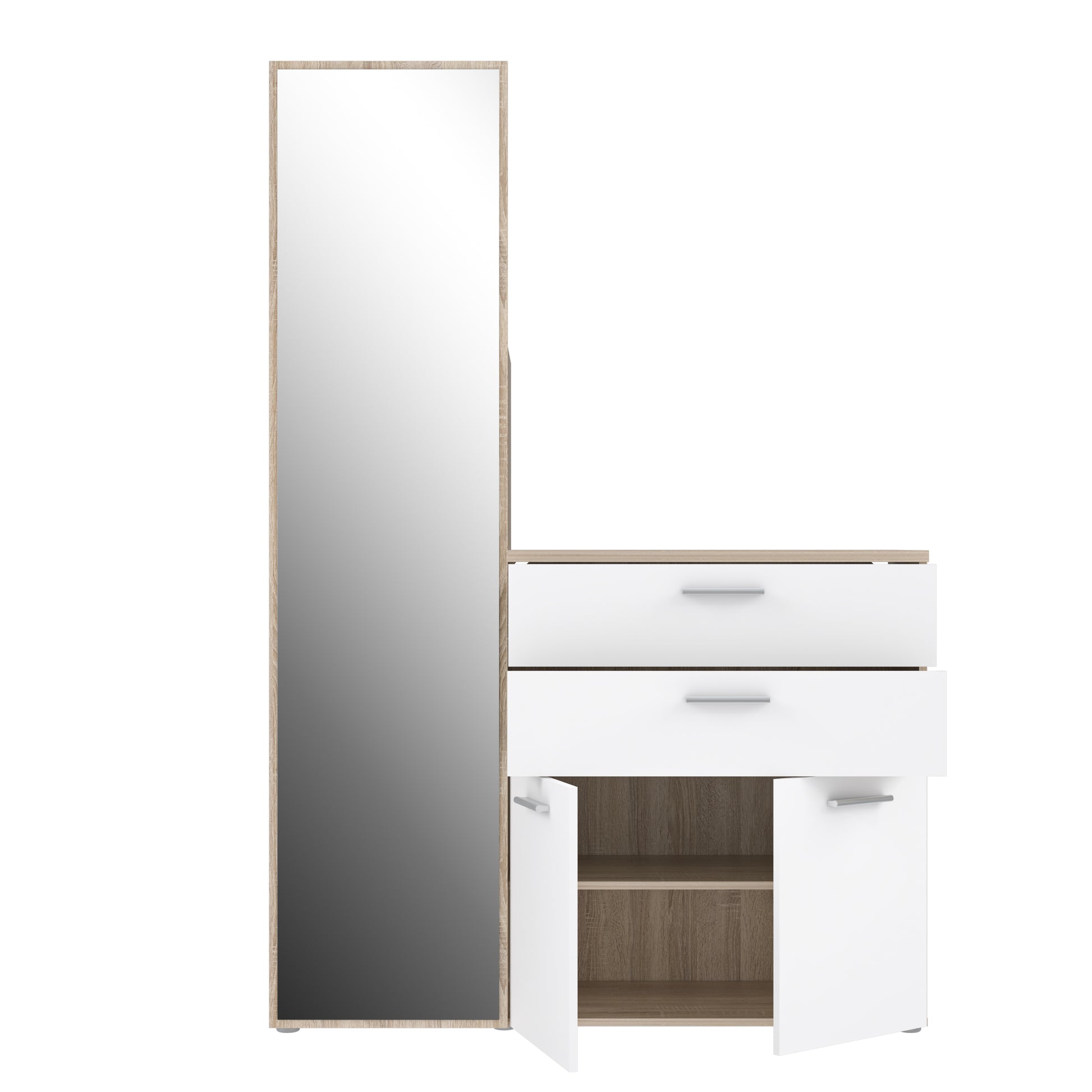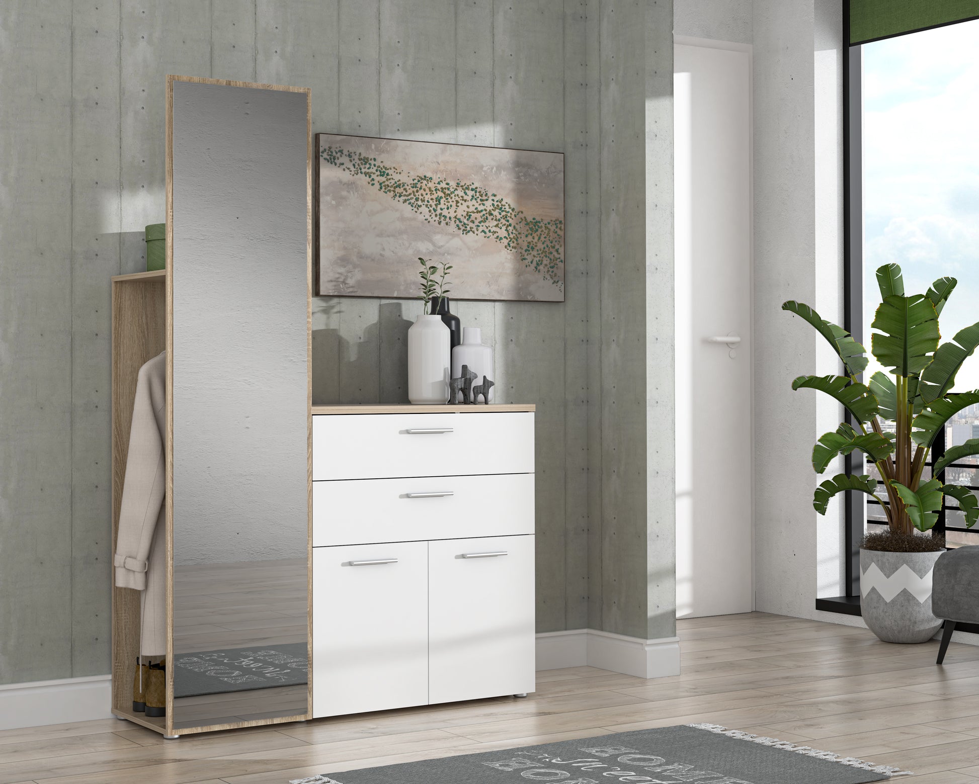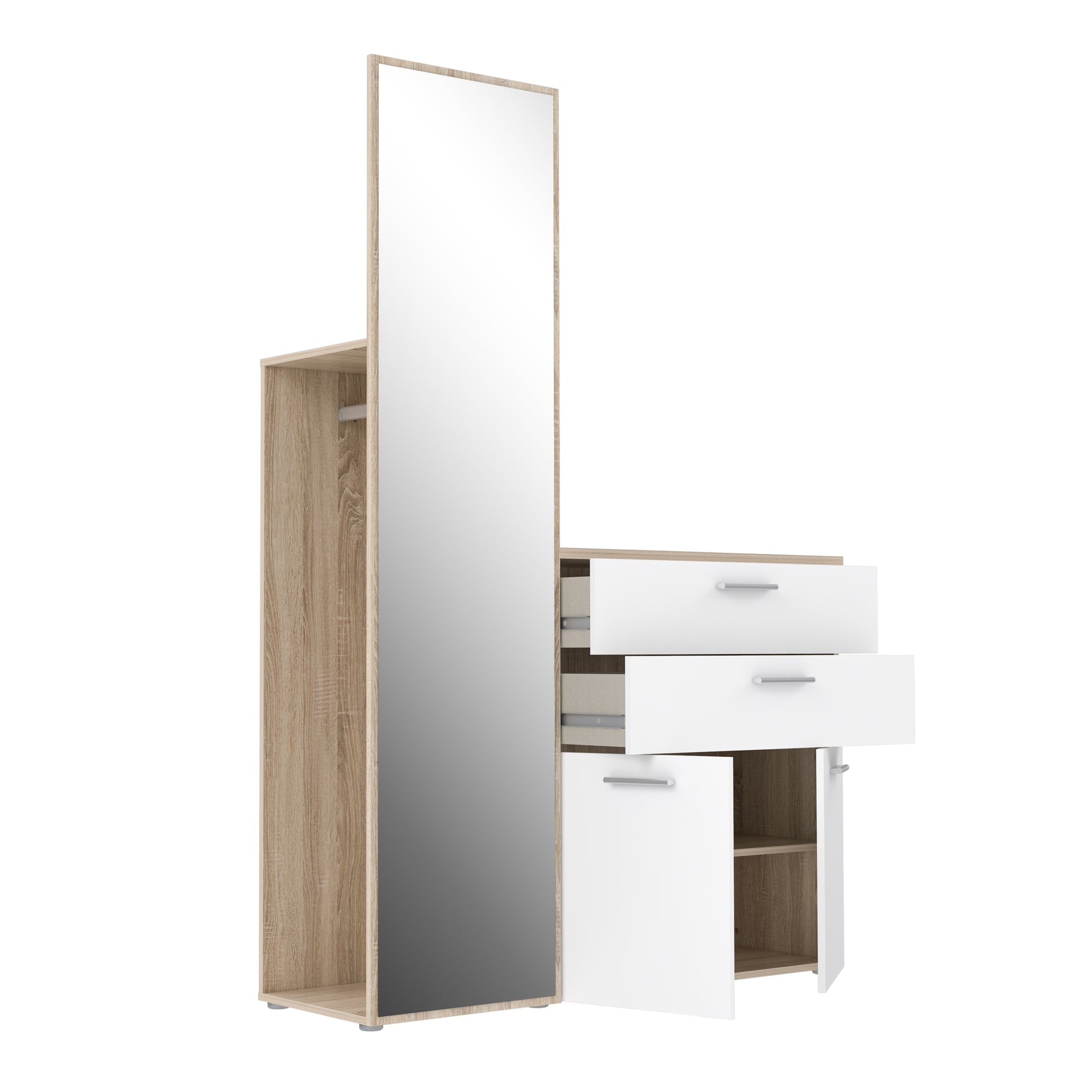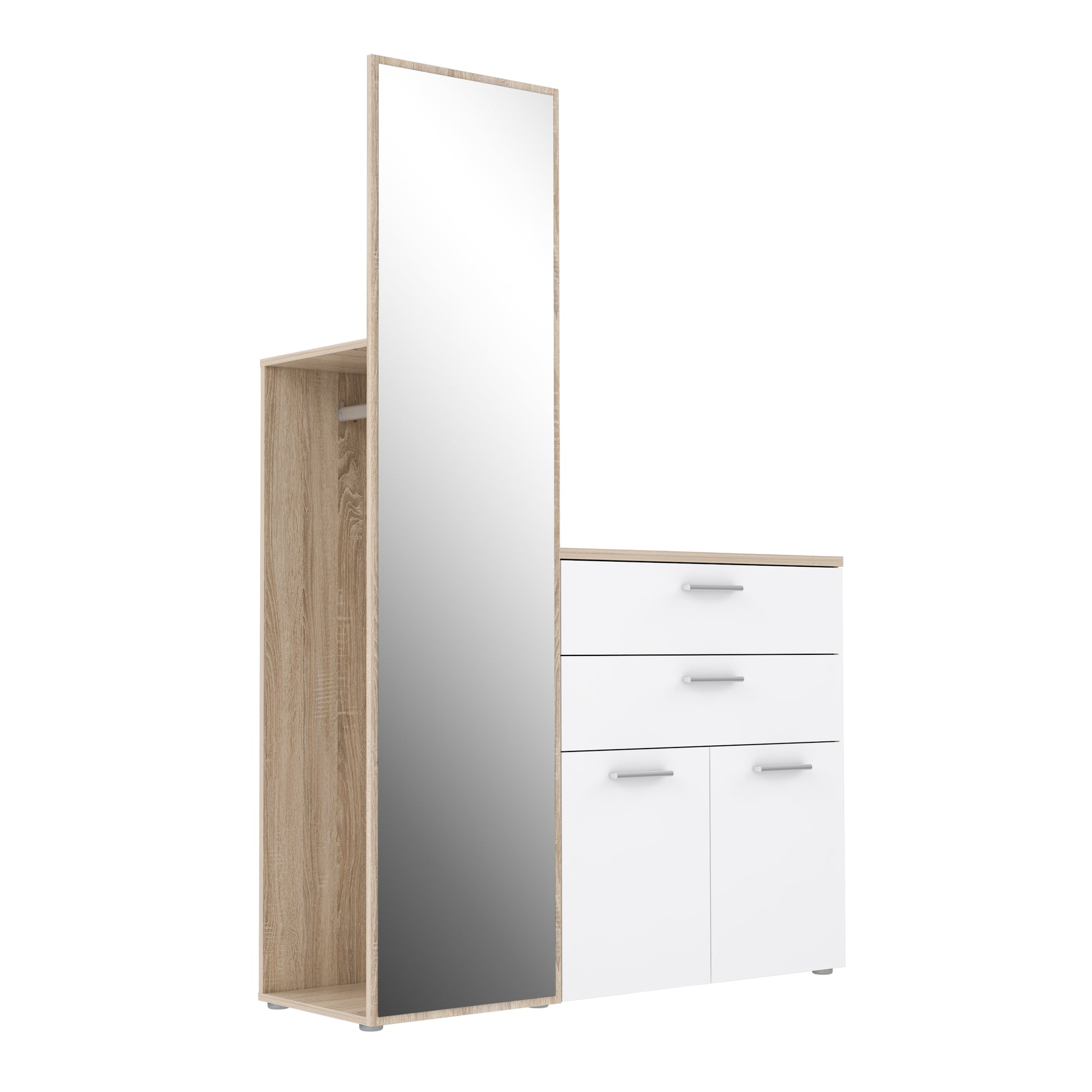 Aprašymas: Ši prieškambario spinta su veidrodžiu, stalčiais ir lentynomis, pagaminta iš aukštos kokybės medžiagų, praturtins jūsų interjerą savo moderniu dizainu. Jos išmatavimai yra 125 cm ilgio, 184.7 cm aukščio ir 41.3 cm pločio. Baldas itin kompaktiškas ir funkcionalus, todėl puikiai tiks kiekvienai erdvei.