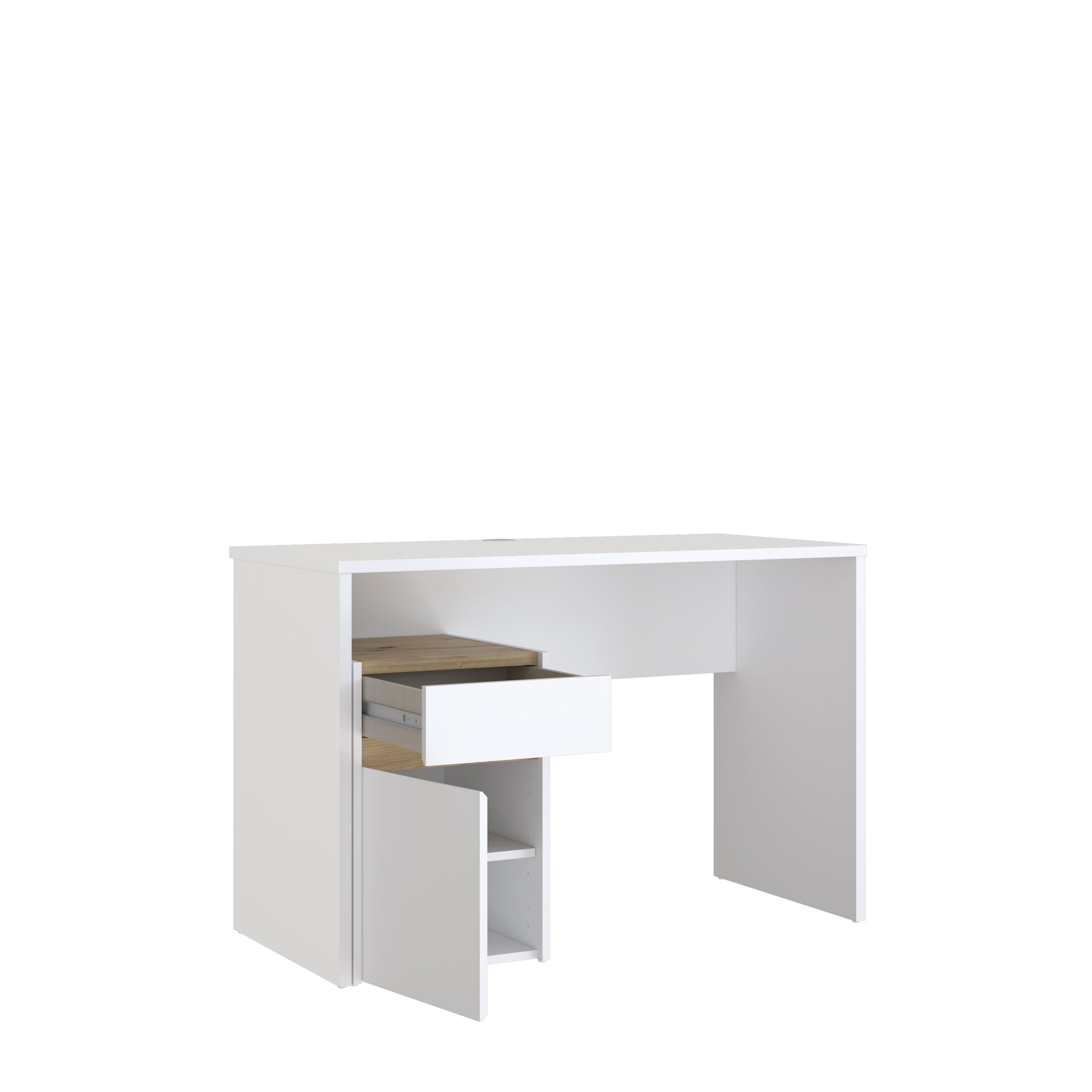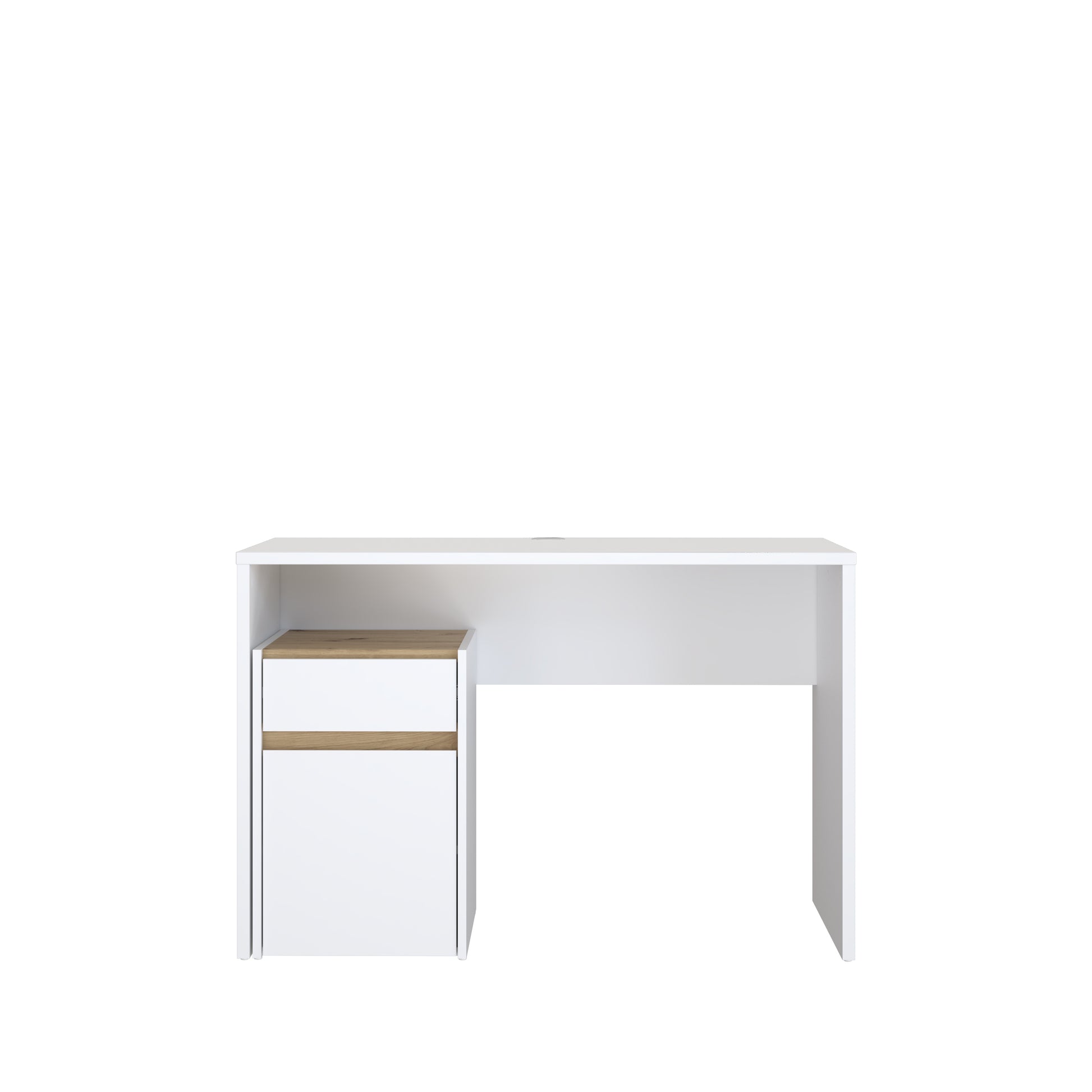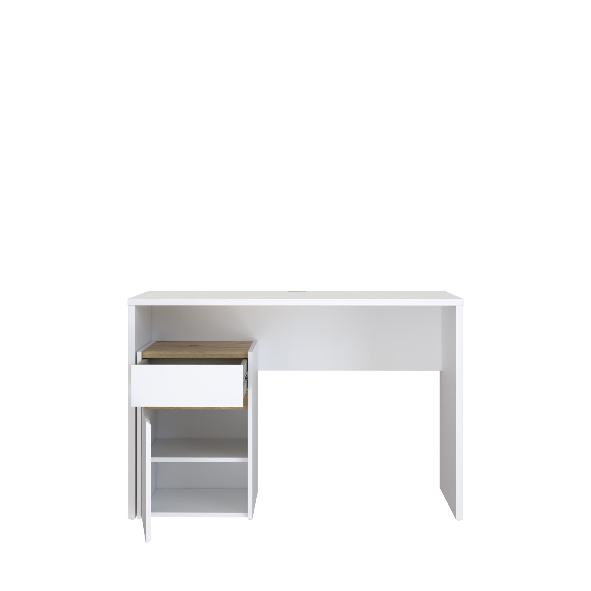 Aprašymas: Šia rašomasis stalas, pagaminta iš aukštos kokybės medžiagų, papildys jūsų interjerą savo moderniu dizainu. Jos išmatavimai yra 110 cm ilgio, 72.7 cm aukščio ir 52.7 cm pločio. Darbo stalas pritaikytas kompiuteriui, bei turi stalčių ir uždaras lentynas. Stalčius su lentynomis, gali būti montuojamas iš abiejų pusių. Galima papildomai užsakyti, stalui pritaikytas lentynas 45Eur.